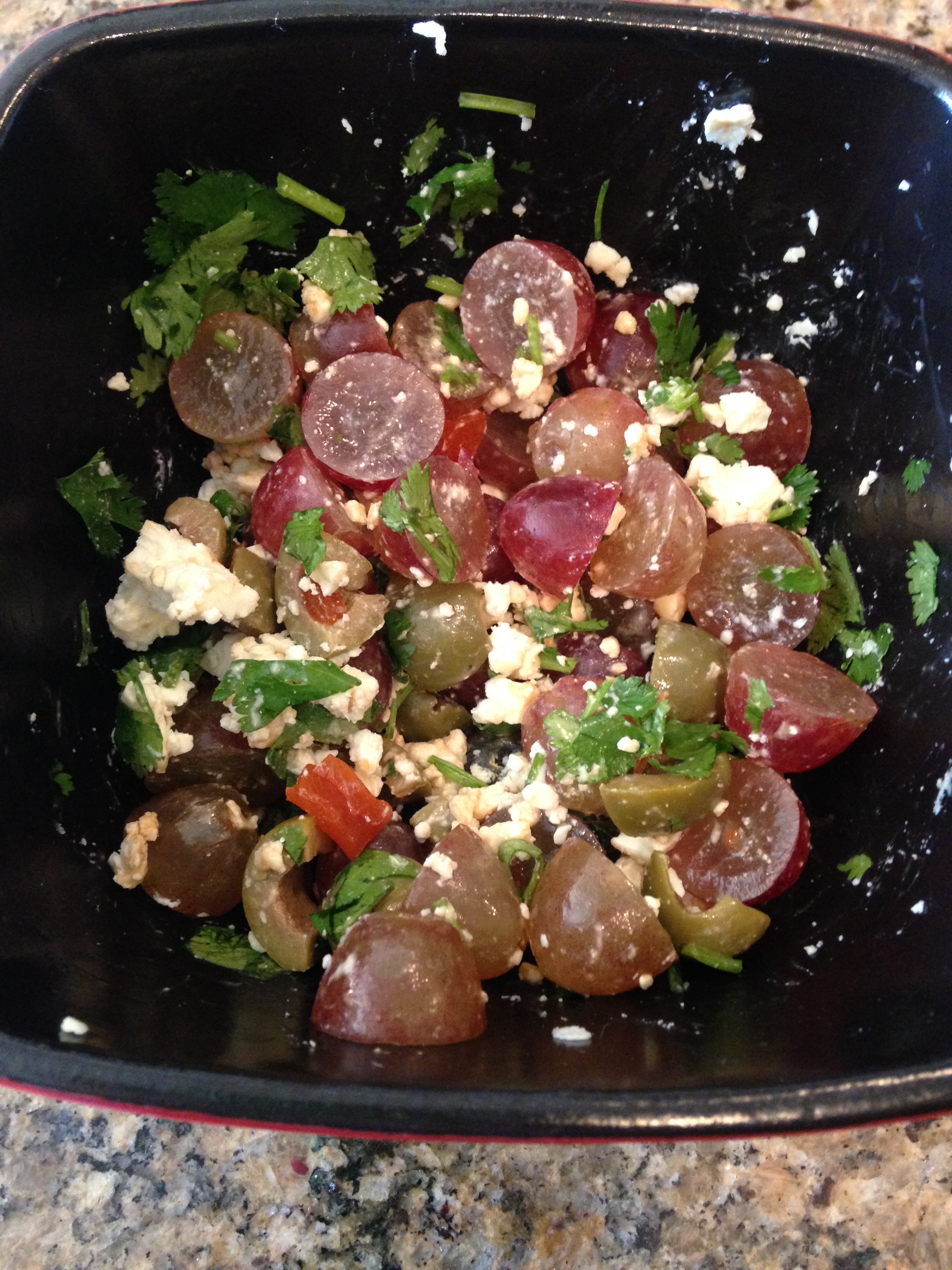 Ingredients : 1 cup grapes cut in half / 5 big green olives chopped in bigger pieces / 1 tbsp of chopped cilantro / 1 cube of blue cheese crumbled / few drops of balsamic vinegar.