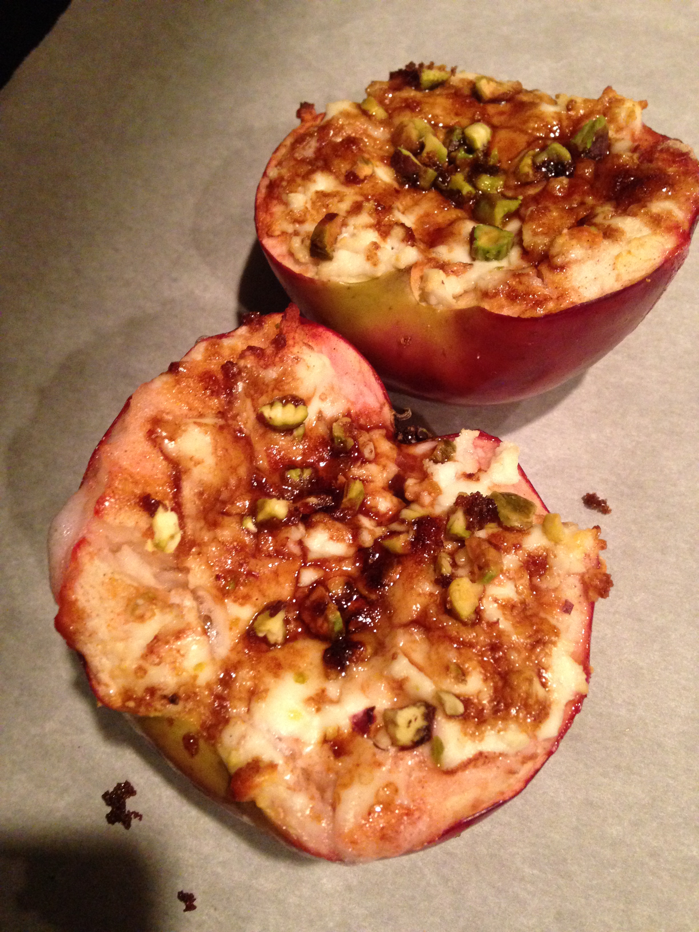Preparation : Pour some cinnamon sugar inside the apples , add the goat cheese, crumbles pistachios , and the brown sugar (1 tbsp for each half but if you prefer sweeter add more) . Put the apples on a baking sheet in the preheated oven 350F and bake for 20 minutes.
