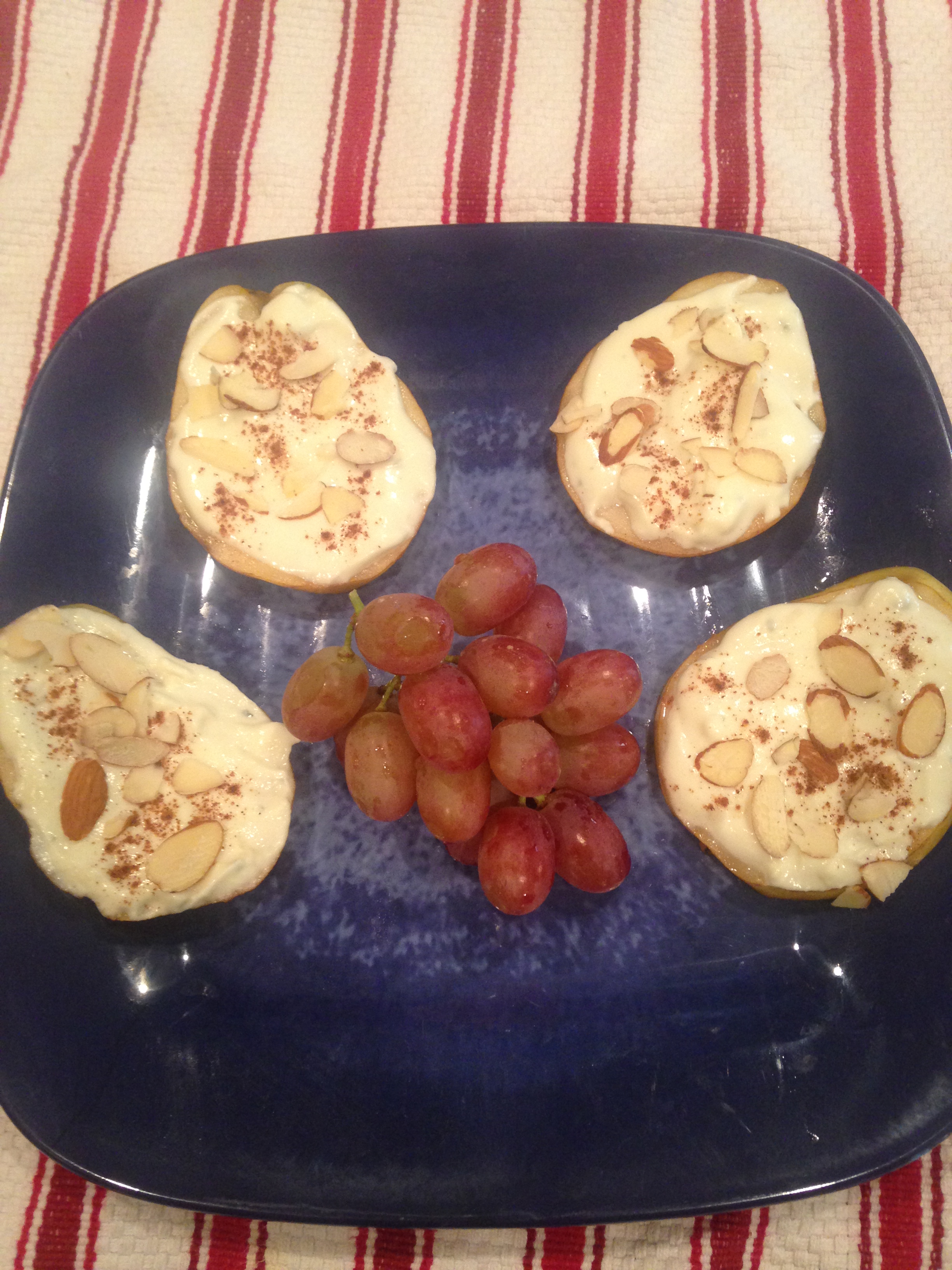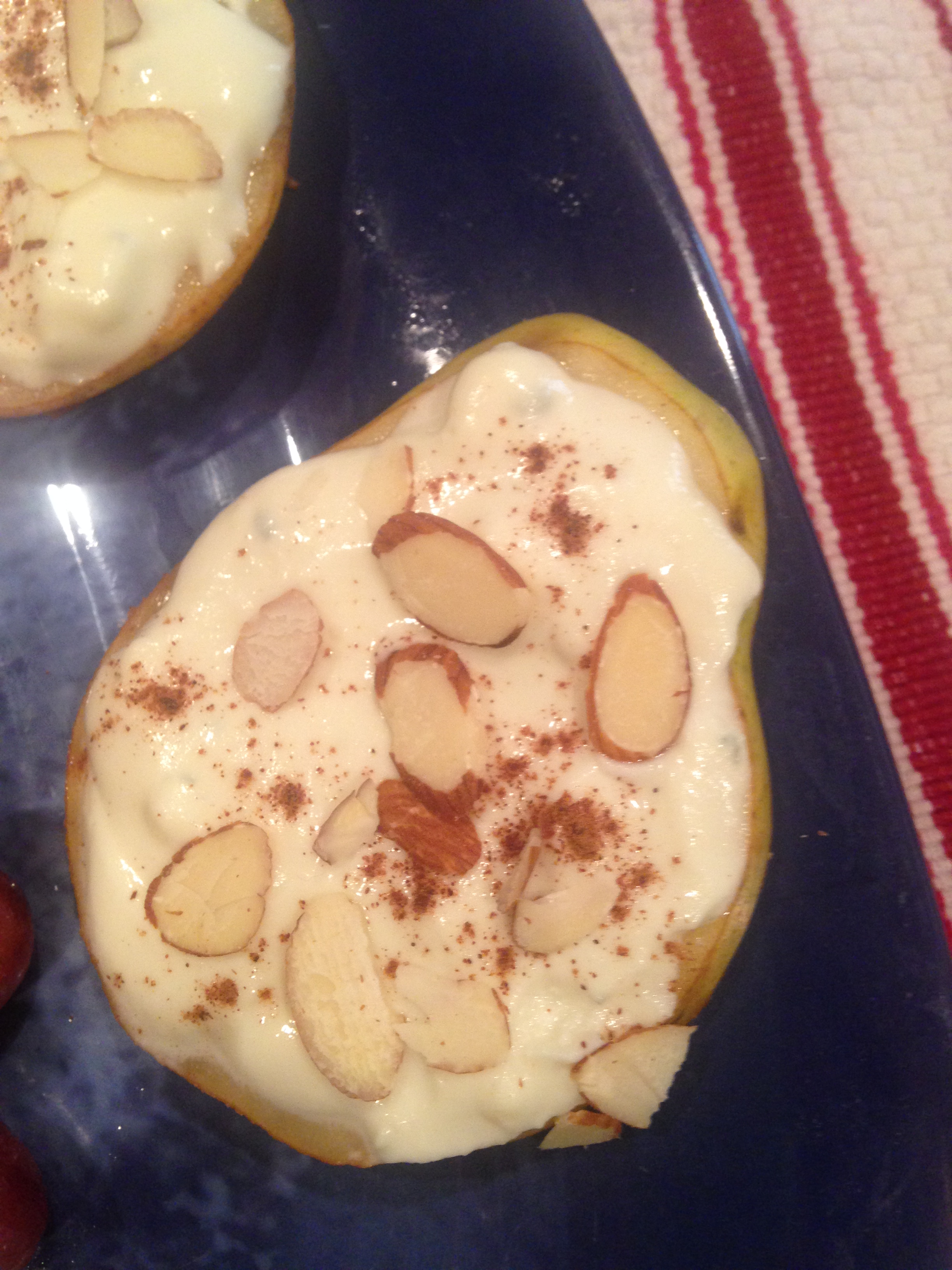 Ingredients: 1 medium pear sliced, goat cheese and blue cheese ( 2 full tbsp. + 1tbsp. ) , ground cinnamon, natural sliced almonds .